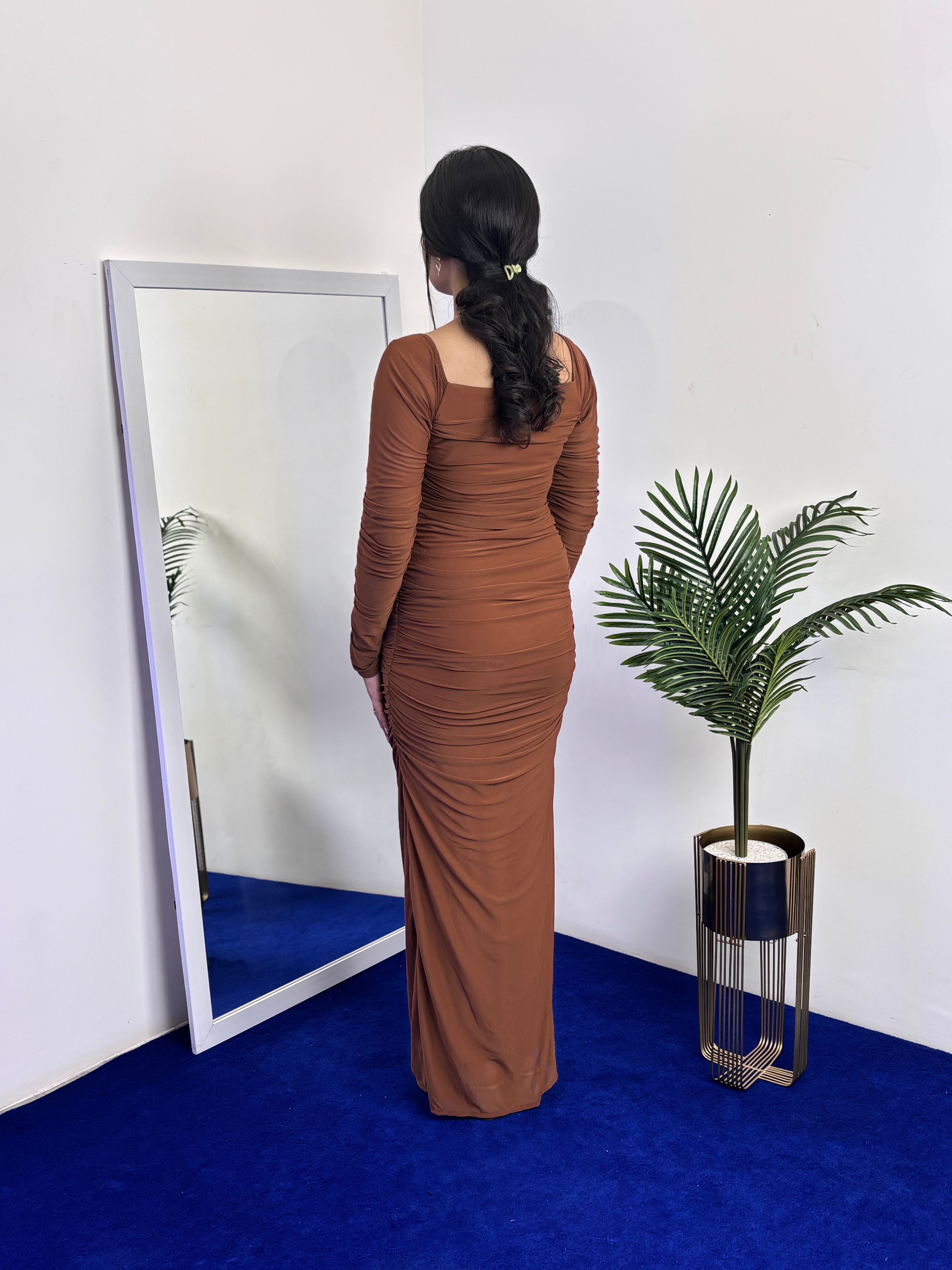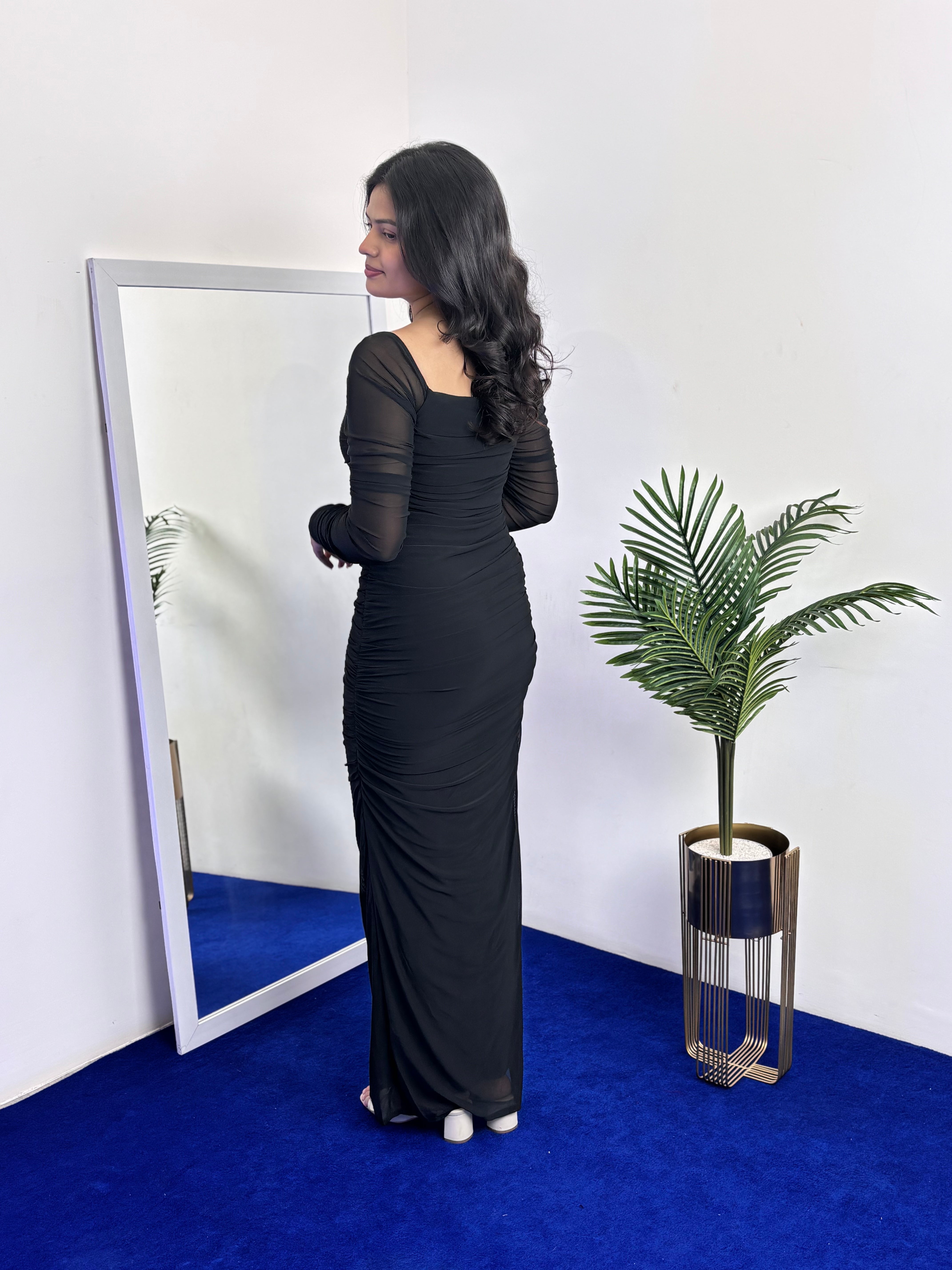 Full Sleeve Ruched Bodycon Dress Engineered for impact, this bodycon dress features premium power mesh fabric that sculpts and supports while maintaining breathability. The ruched detailing adds dimension and flatters every curve, while full sleeves provide sophisticated coverage without compromising the sleek silhouette. Designed for evening events and celebrations, this piece transitions seamlessly from cocktail gatherings to dance floors. The stretch-infused construction ensures comfort throughout the night, while the structured fit delivers that coveted confident look. Perfect for those who demand both style and substance in their partywear.