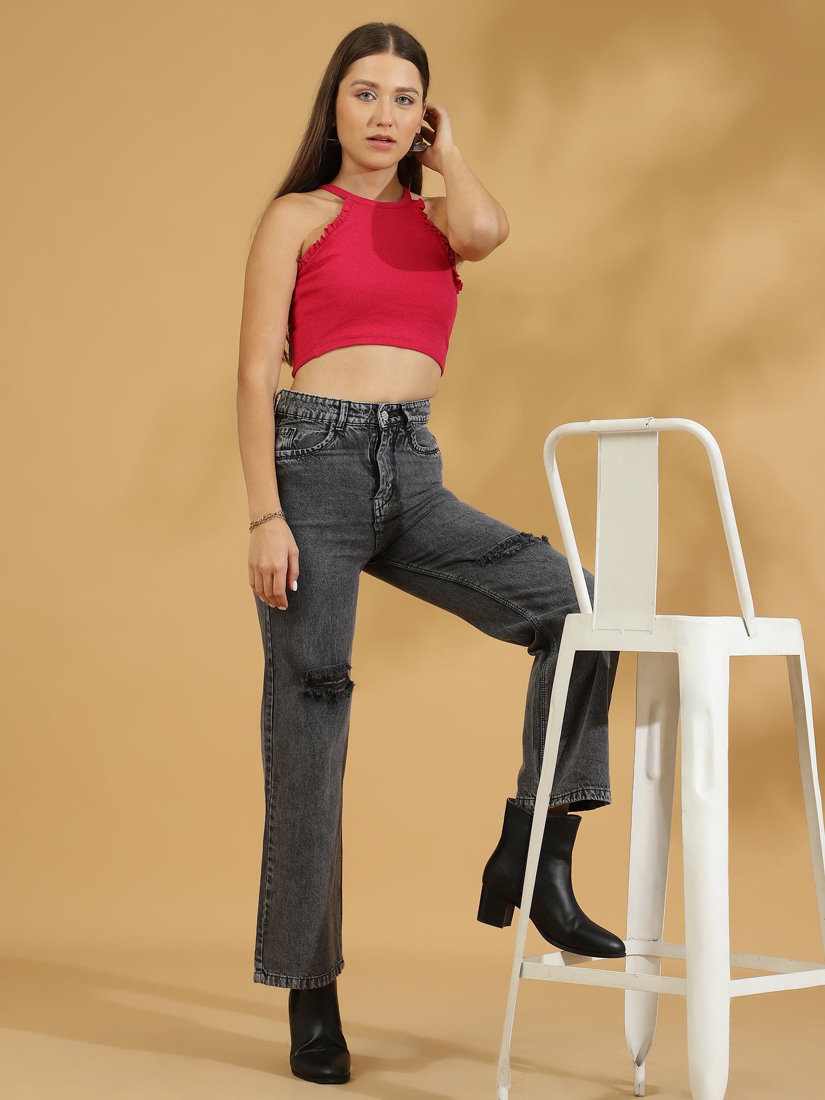 Add an edge to your denim collection with the High Rise Distressed Straight Fit Jean. These jeans combine a high-rise waist with a straight leg fit and distressed detailing for a trendy, lived-in look. Made from high-quality denim, they provide both comfort and style. Perfect for a casual day out or a night on the town, the High Rise Distressed Straight Fit Jean effortlessly elevates your outfit with a touch of attitude.