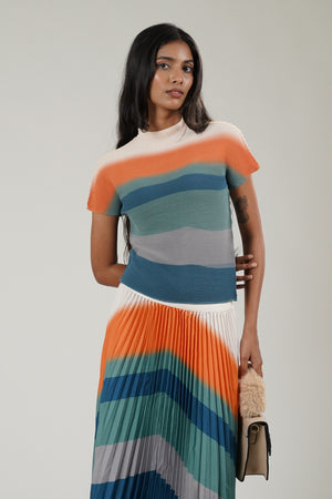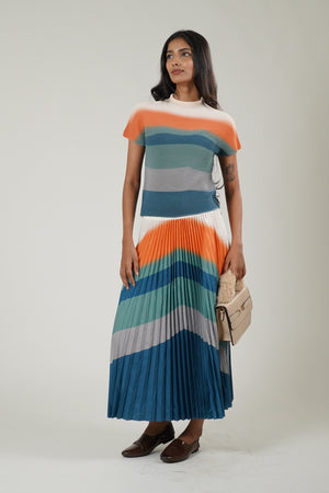 A Mock Neck Tee & Pleated Skirt co-ord set featuring a pleated skirt and matching top.
