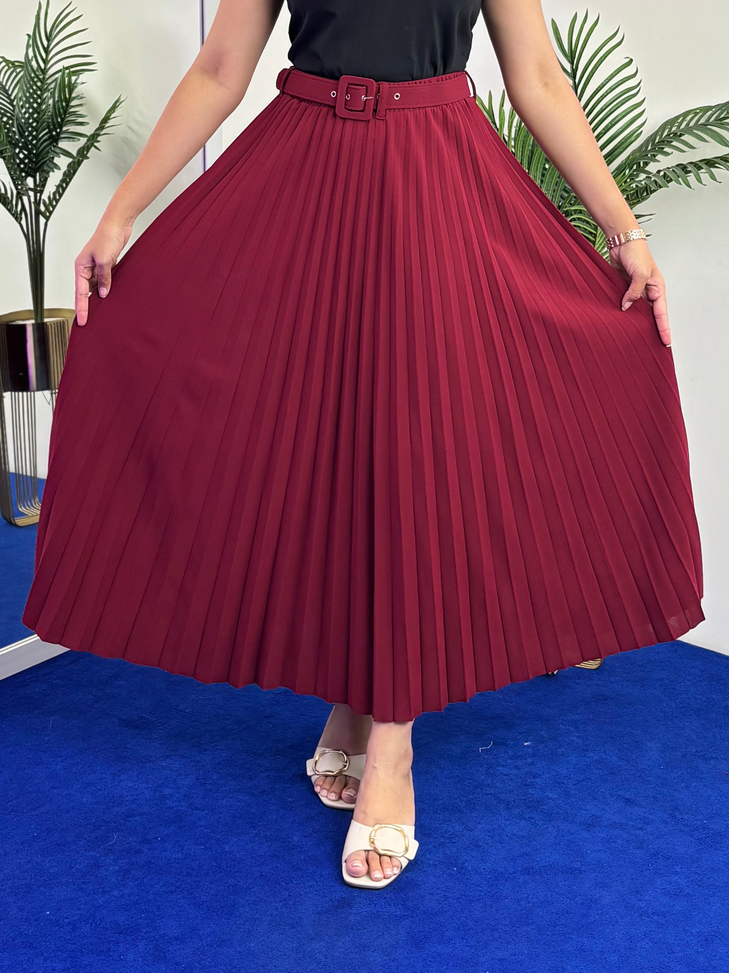 This high-waisted pleated flared skirt combines timeless silhouette with modern comfort. Crafted from lightweight poly crepe fabric, it drapes beautifully while maintaining its shape throughout the day. The structured pleats create elegant volume, while the regular fit flatters various body types. An elastic closure ensures effortless wear, and the included belt allows you to define your waist and customize your look. Perfect for both professional settings and casual occasions, this versatile piece transitions seamlessly from day to evening.