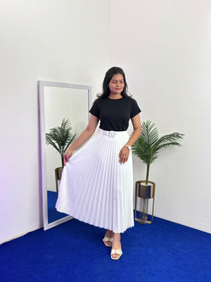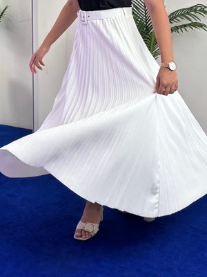 This high-waisted pleated flared skirt combines timeless silhouette with modern comfort. Crafted from lightweight poly crepe fabric, it drapes beautifully while maintaining its shape throughout the day. The structured pleats create elegant volume, while the regular fit flatters various body types. An elastic closure ensures effortless wear, and the included belt allows you to define your waist and customize your look. Perfect for both professional settings and casual occasions, this versatile piece transitions seamlessly from day to evening.