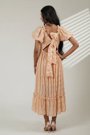This puff sleeve dress features a stylish backless design that adds an elegant touch. Its free-size fit offers versatile comfort, making it suitable for various body types. Ideal for both casual outings and special occasions, this dress effortlessly blends fashion with ease of wear.