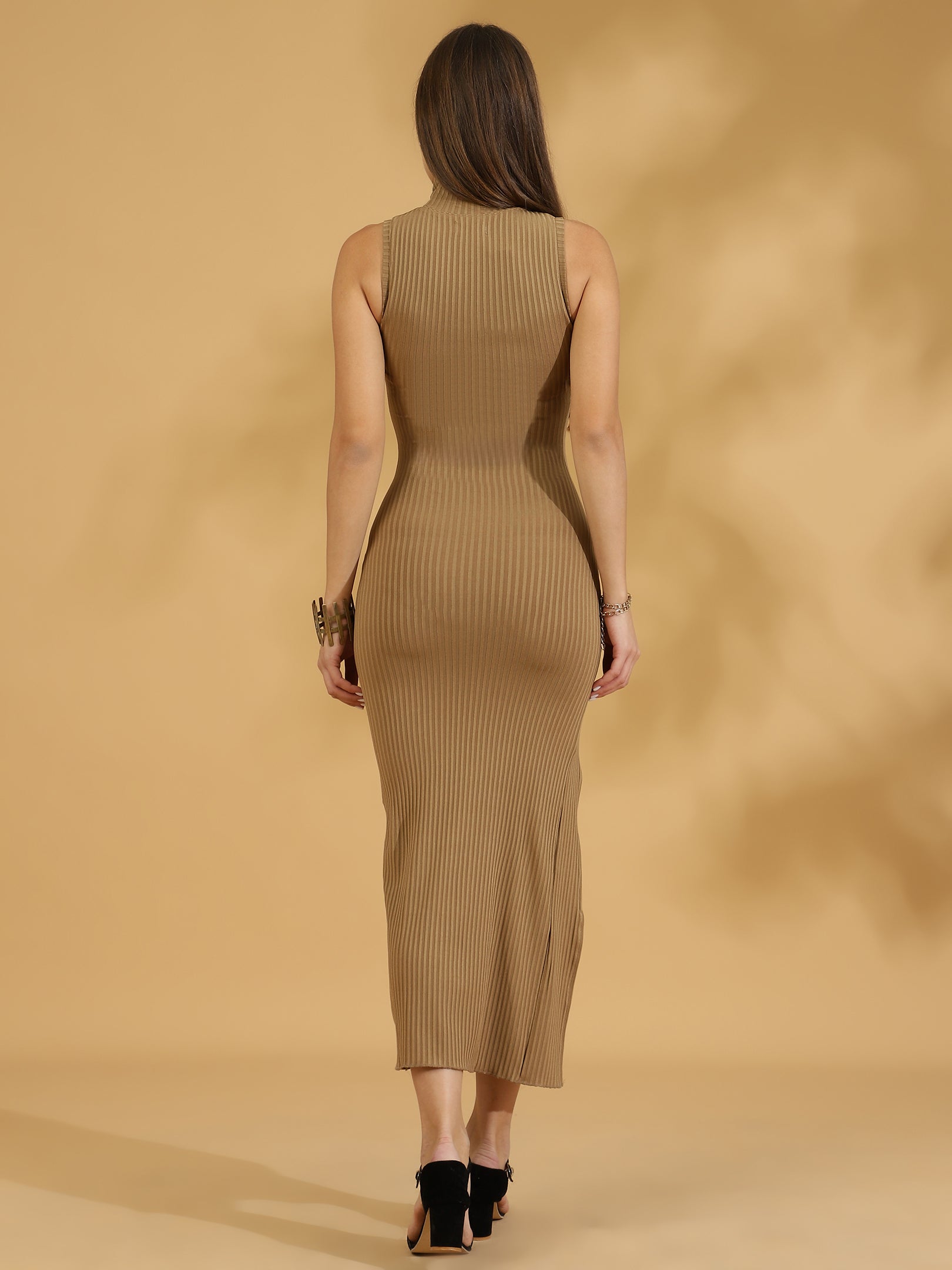 This black ribbed sleeveless bodycon dress is expertly designed to contour the body with a flattering fit. Made from a stretchy ribbed fabric, it provides both comfort and structure, perfect for day-to-night wear. Its minimalist style makes it a versatile foundation piece for sophisticated layering or standout solo looks.