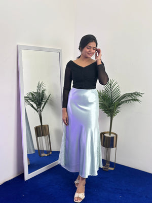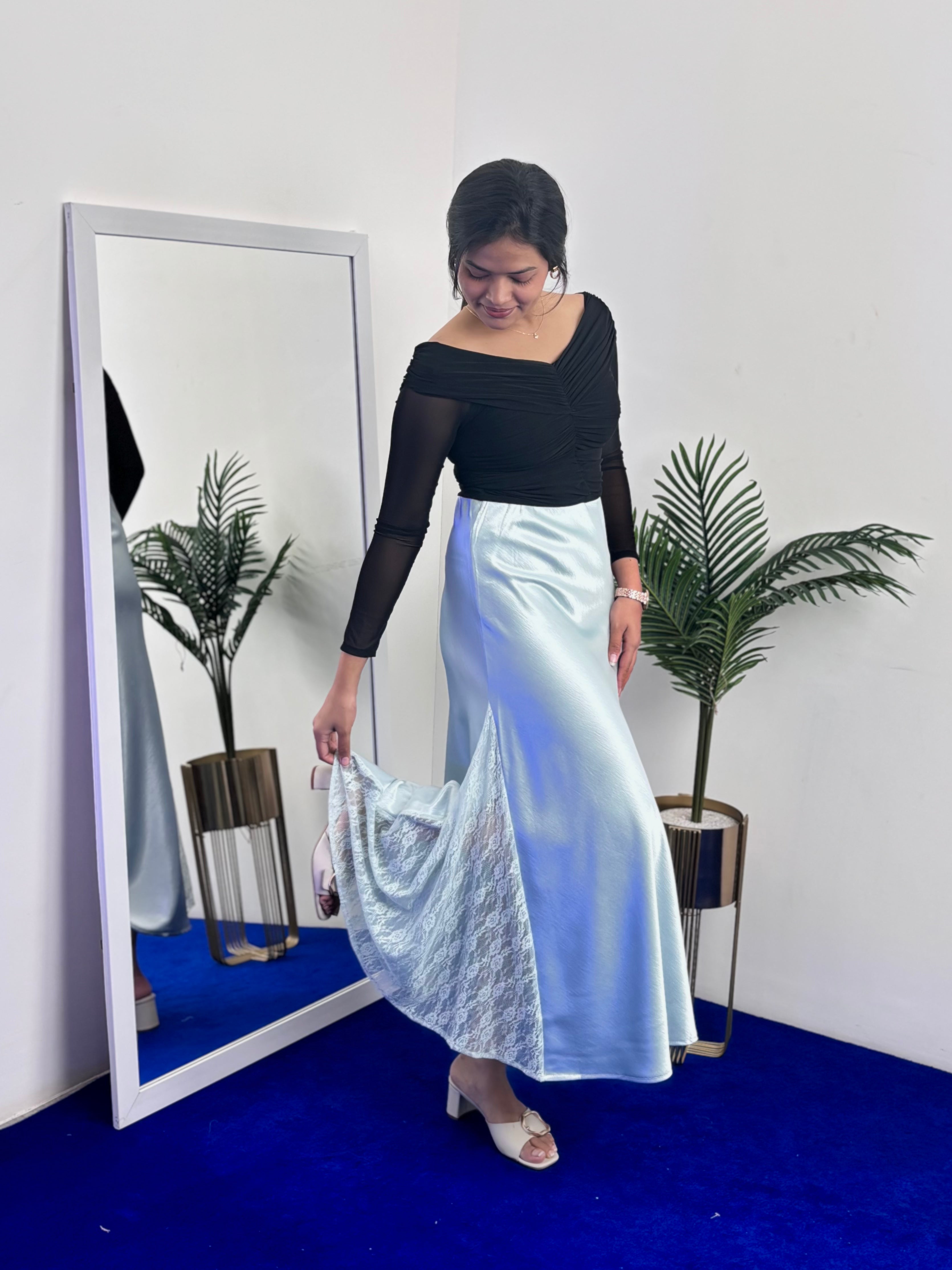 Shiny Satin A-Line Skirt with Side Lace (Blue)