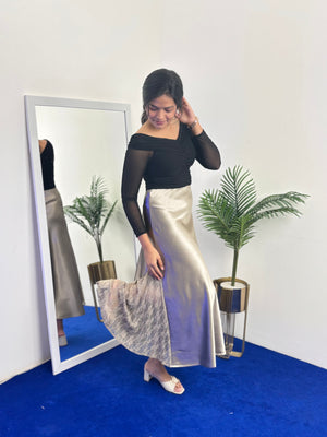 Elevate your wardrobe with this sophisticated A-line skirt crafted from lustrous satin that catches the light beautifully. The high-waist silhouette flatters your figure while the regular fit ensures comfortable all-day wear. Delicate lace detailing adorns the sides, adding an elegant touch of femininity. The elastic closure provides effortless dressing without compromising on style. Perfect for both casual outings and semi-formal occasions, this grey skirt transitions seamlessly from day to evening wear.
