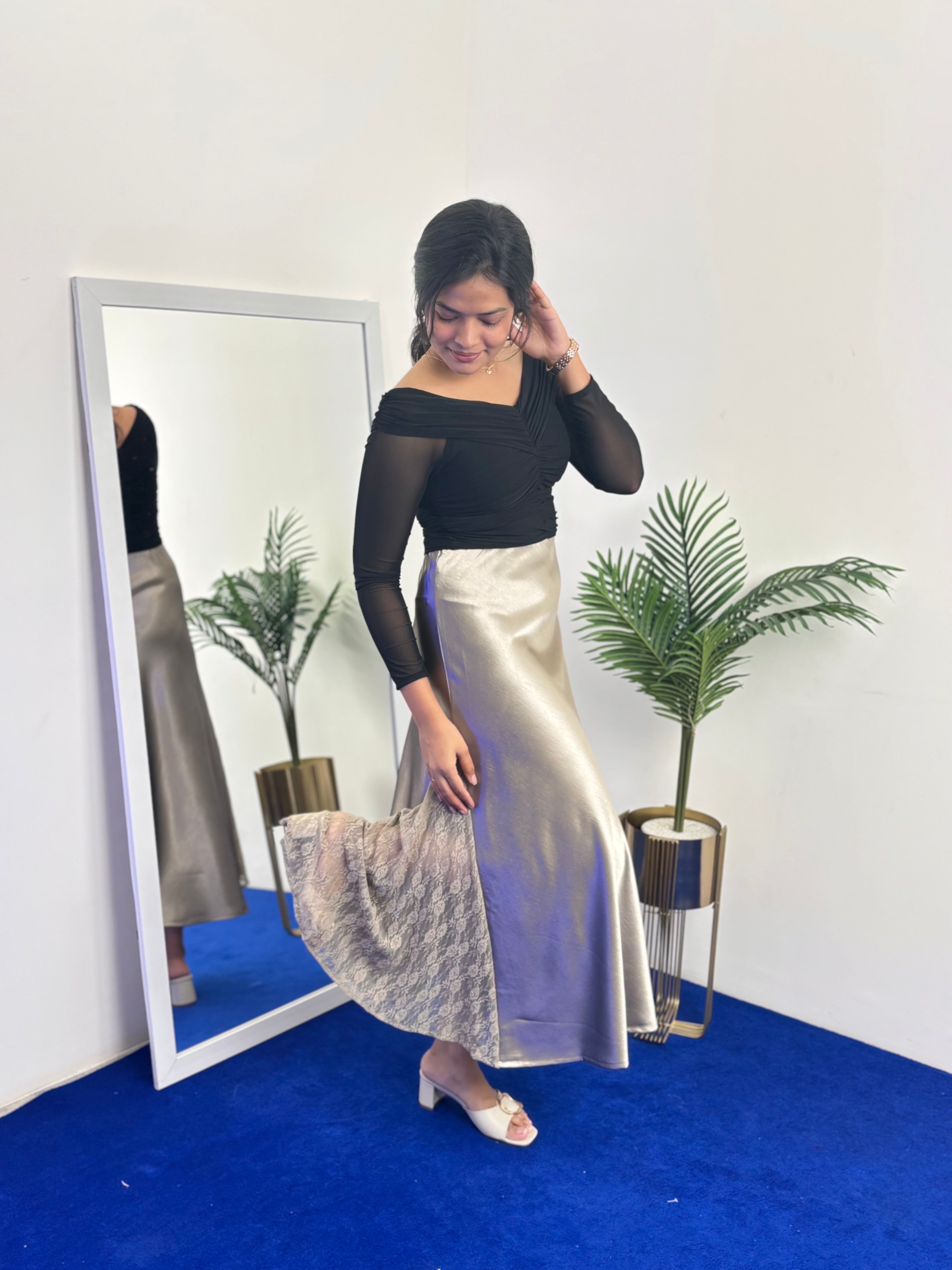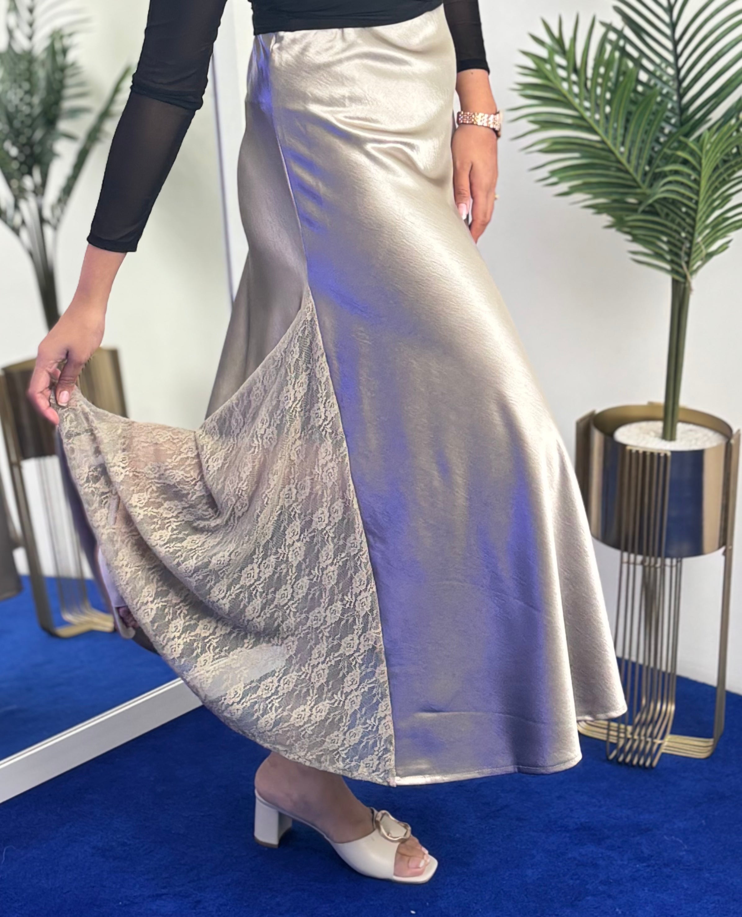 Shiny Satin A-Line Skirt with Side Lace (Silver)