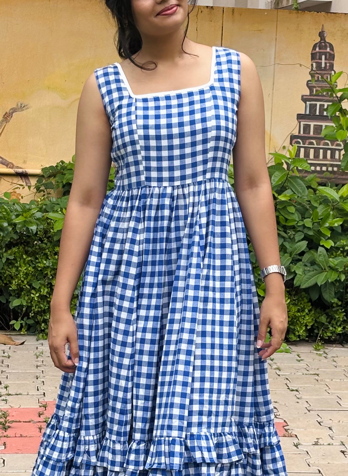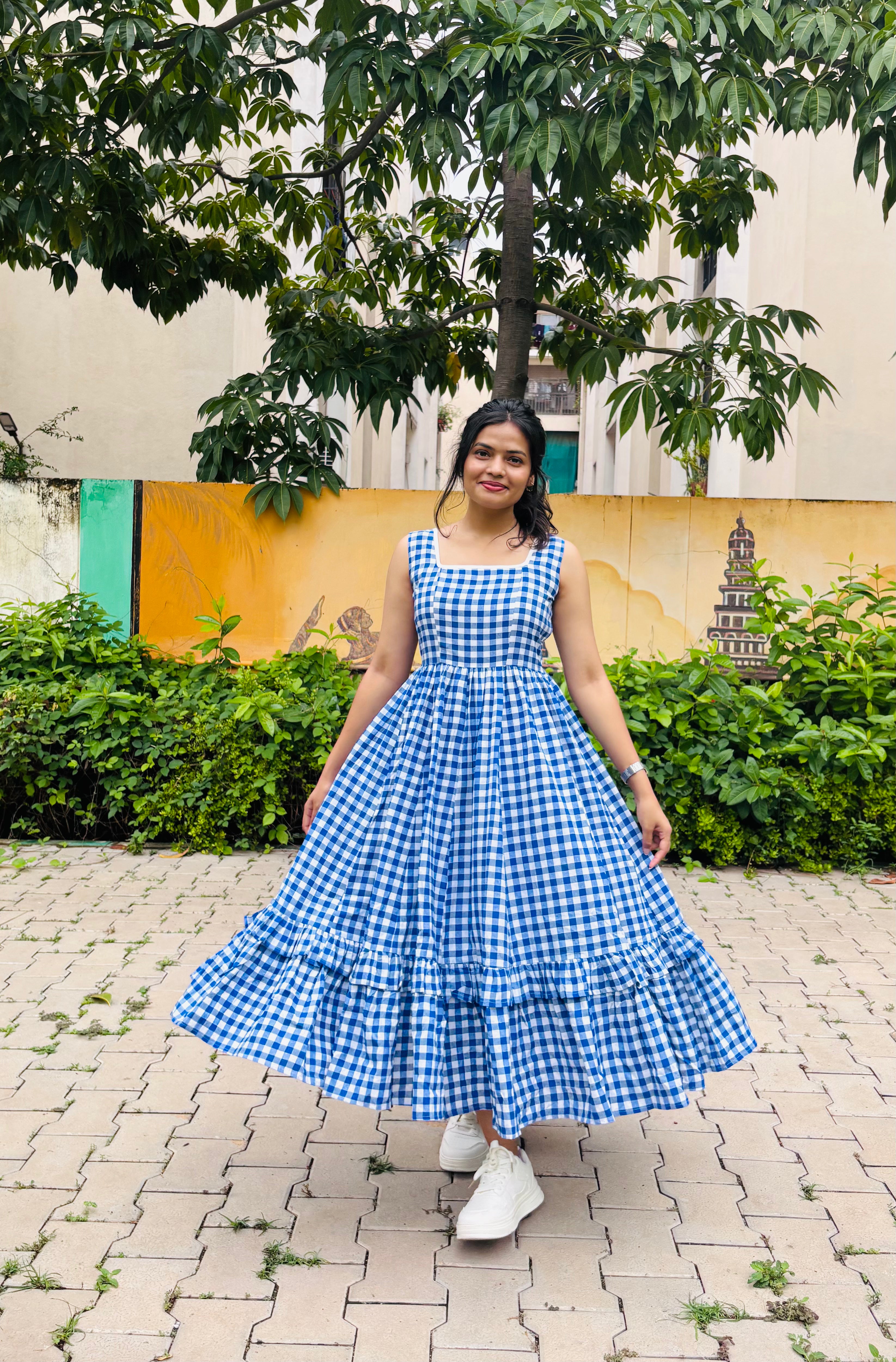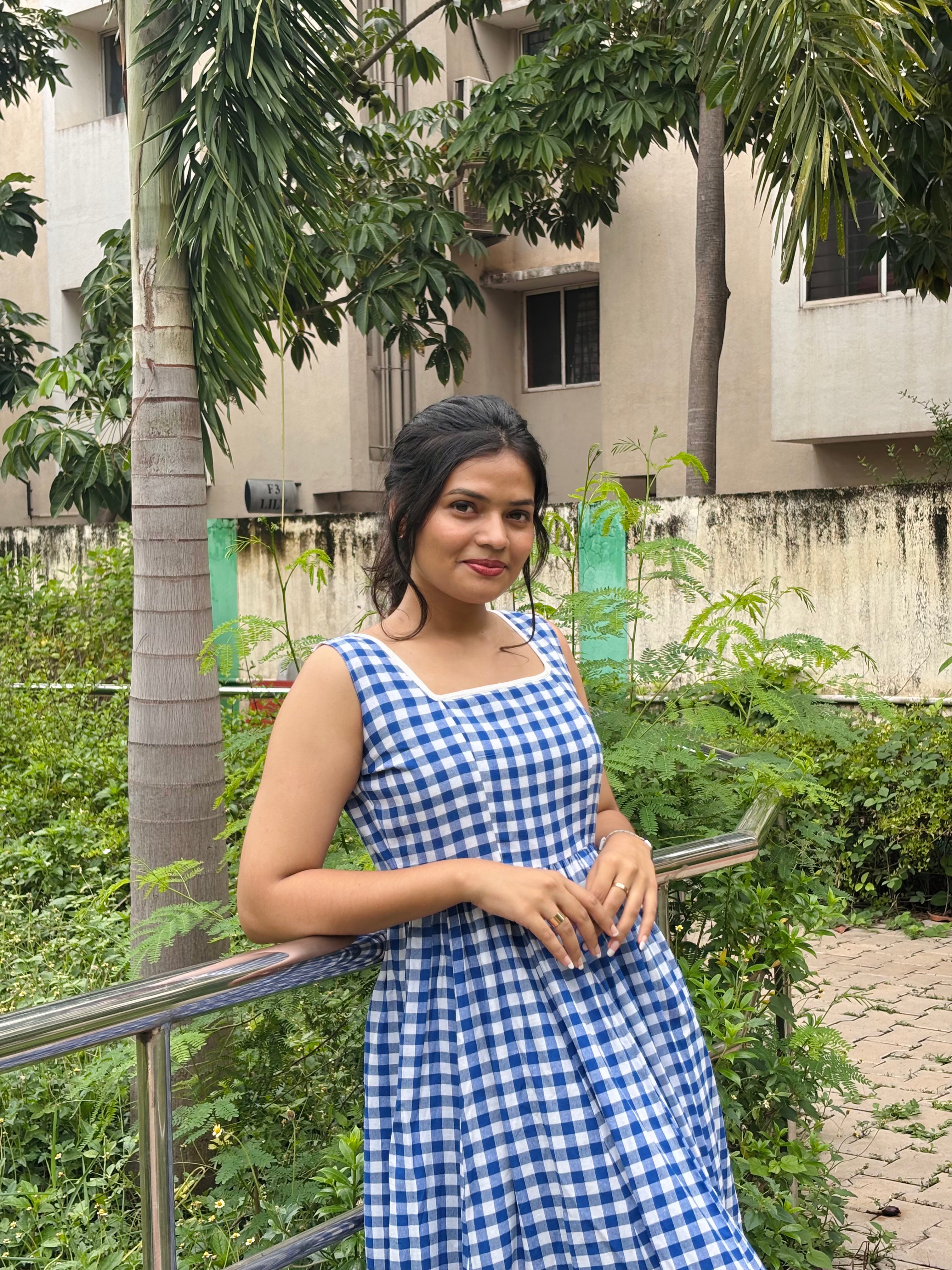 Crafted from breathable cotton fabric, this dress features a classic checked pattern that never goes out of style. The sleeveless design offers a relaxed, airy feel, making it ideal for daytime wear. Its A-line silhouette flatters all body types, while thoughtful details such as a square add to its practicality and charm. Designed for ease and versatility, this dress transitions effortlessly from brunch dates to evening strolls.