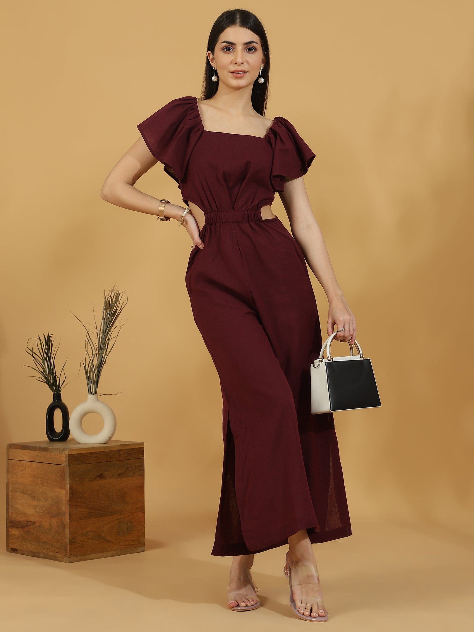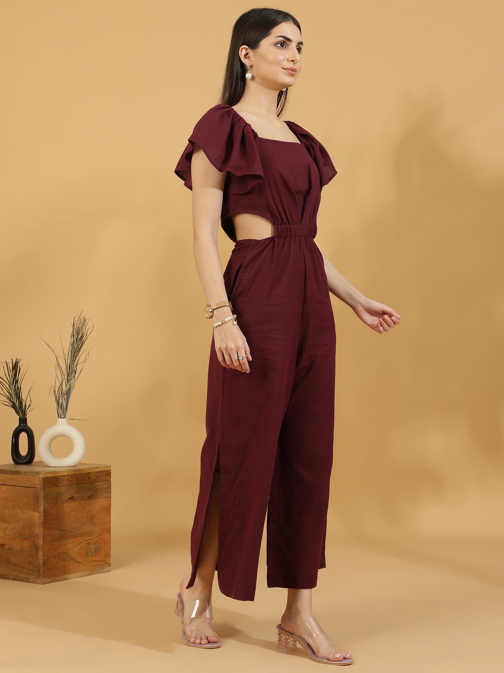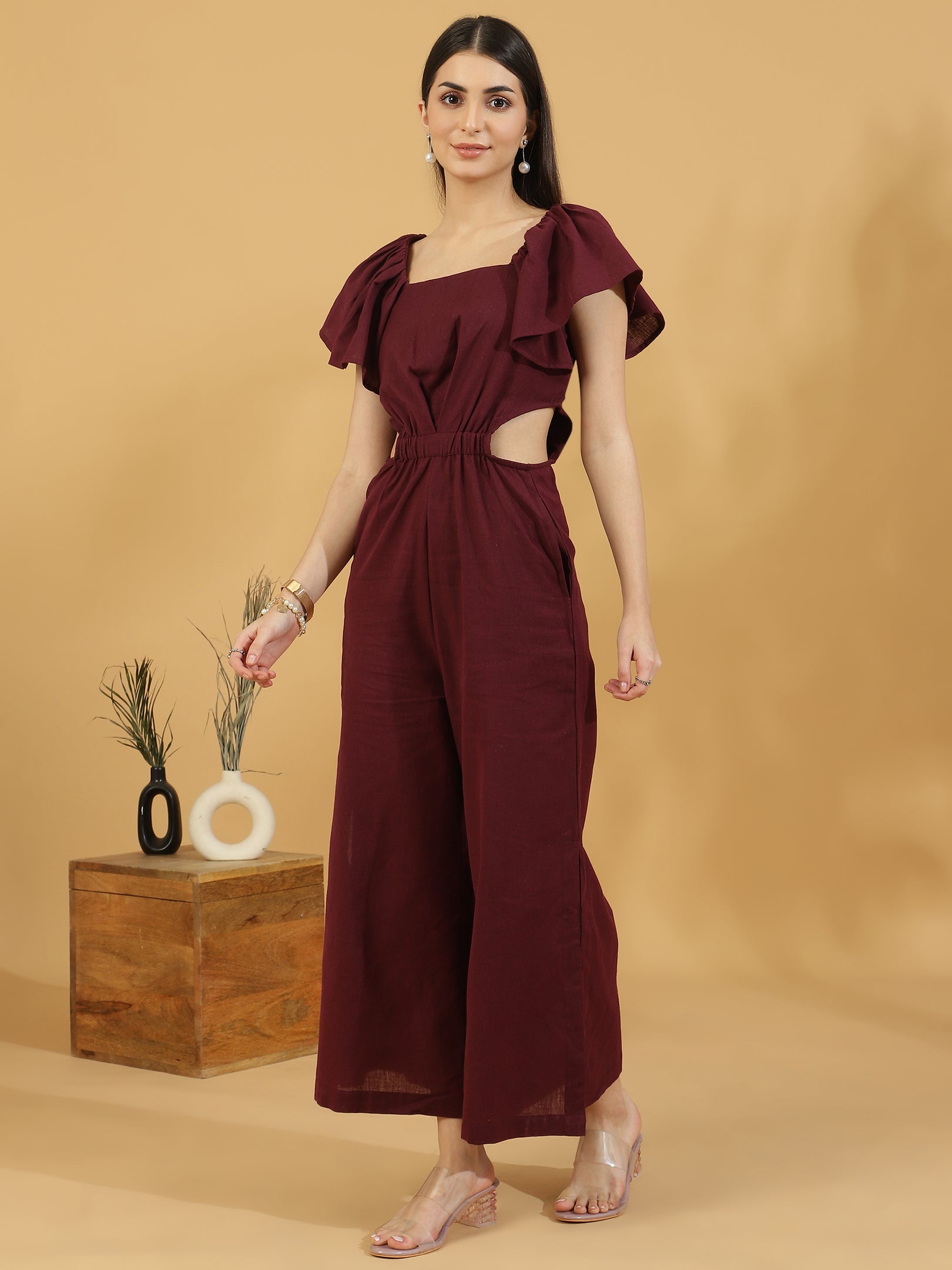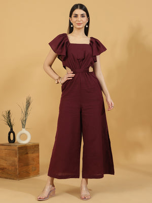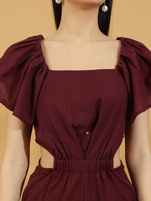 Solid Cutout Sleeveless Jumpsuit (Maroon)