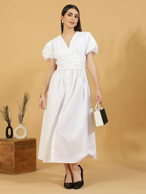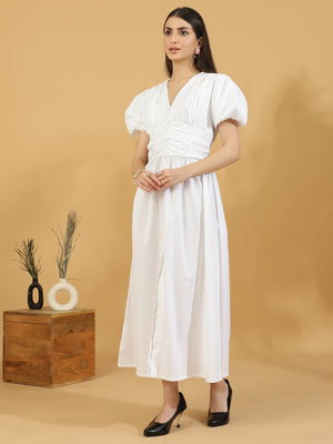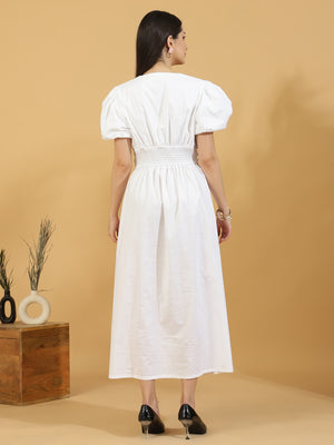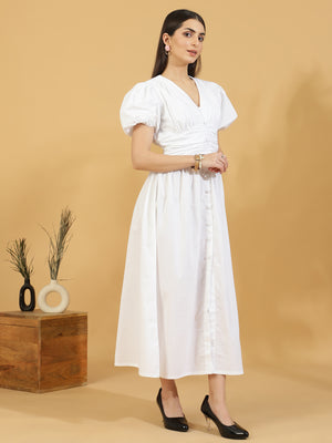 Crafted from soft, breathable fabric, this dress features structured puff sleeves that add volume and charm to the shoulders, while its button-down front gives it a timeless, tailored appeal. The solid color makes it easy to accessorize, offering endless styling possibilities—from a relaxed daytime look with sneakers to a polished evening outfit with heels. The cinched waistline subtly enhances your silhouette, while the flared hem ensures graceful movement and comfort.