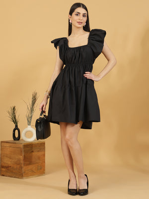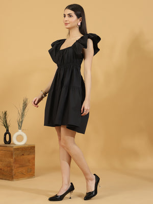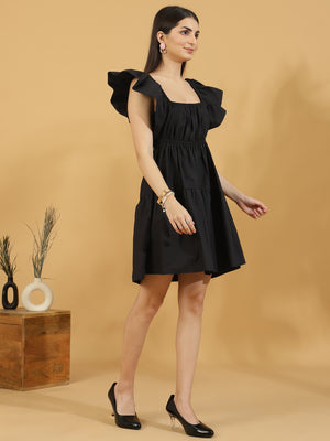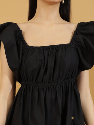 Solid Squared Neck Puff Sleeve One Piece Dress (Black)