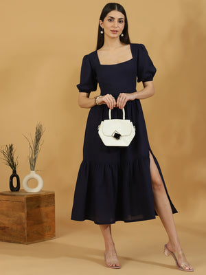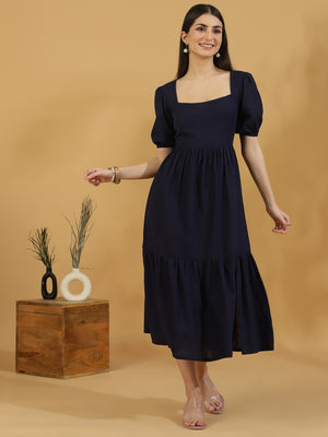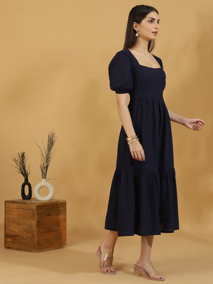 Squared Neck Sleeve Tiered Dress (Navy Blue)